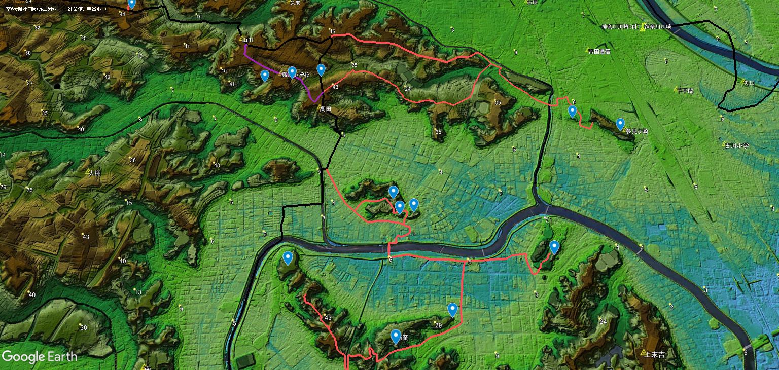 いやあ、こうして俯瞰して見てみると、多摩川と鶴見川の分水嶺(画面左上から右下の黒線)と、早渕川から一尾根越えて鶴見川に行き鶴見川を遡るライン(その南の赤線)に囲まれたエリアが麻生郷で、海から来て早淵川に入ると、4つの論社があり、その4つの論社はほぼ同じエリアに固まっていて、遡ると都筑郡郡衙があり、古墳群もあります。
